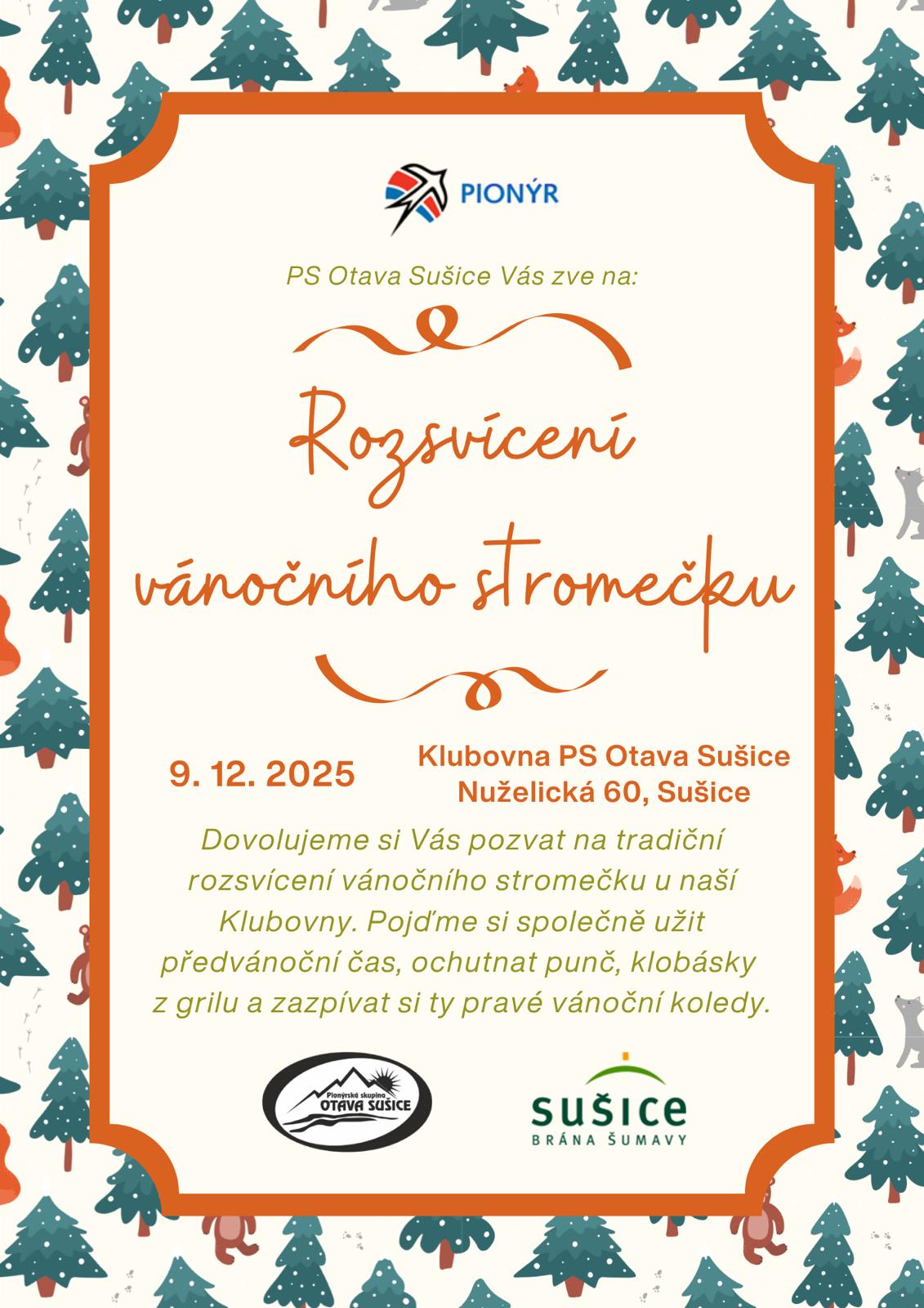 Dovolujeme si Vás pozvat na tradiční rozsvícení vánočního stromečku u naší Klubovny. Pojďme si společně užít předvánoční čas, ochutnat punč, klobásky z grilu a zazpívat si ty pravé vánoční koledy.