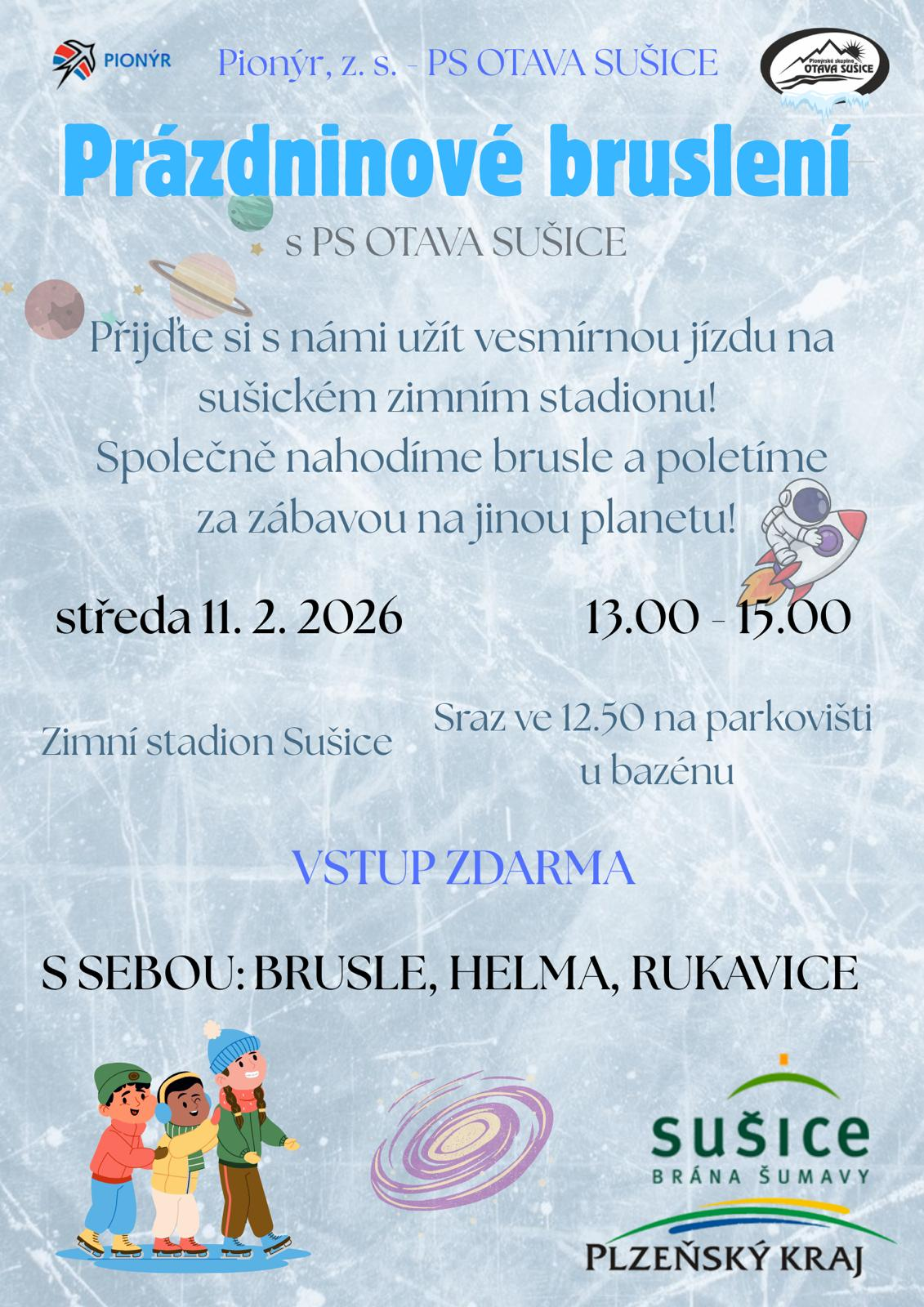 Přijďte si s námi užít vesmírnou jízdu na sušickém zimním stadionu! Společně nahodíme brusle a poletíme za zábavou na jinou planetu!